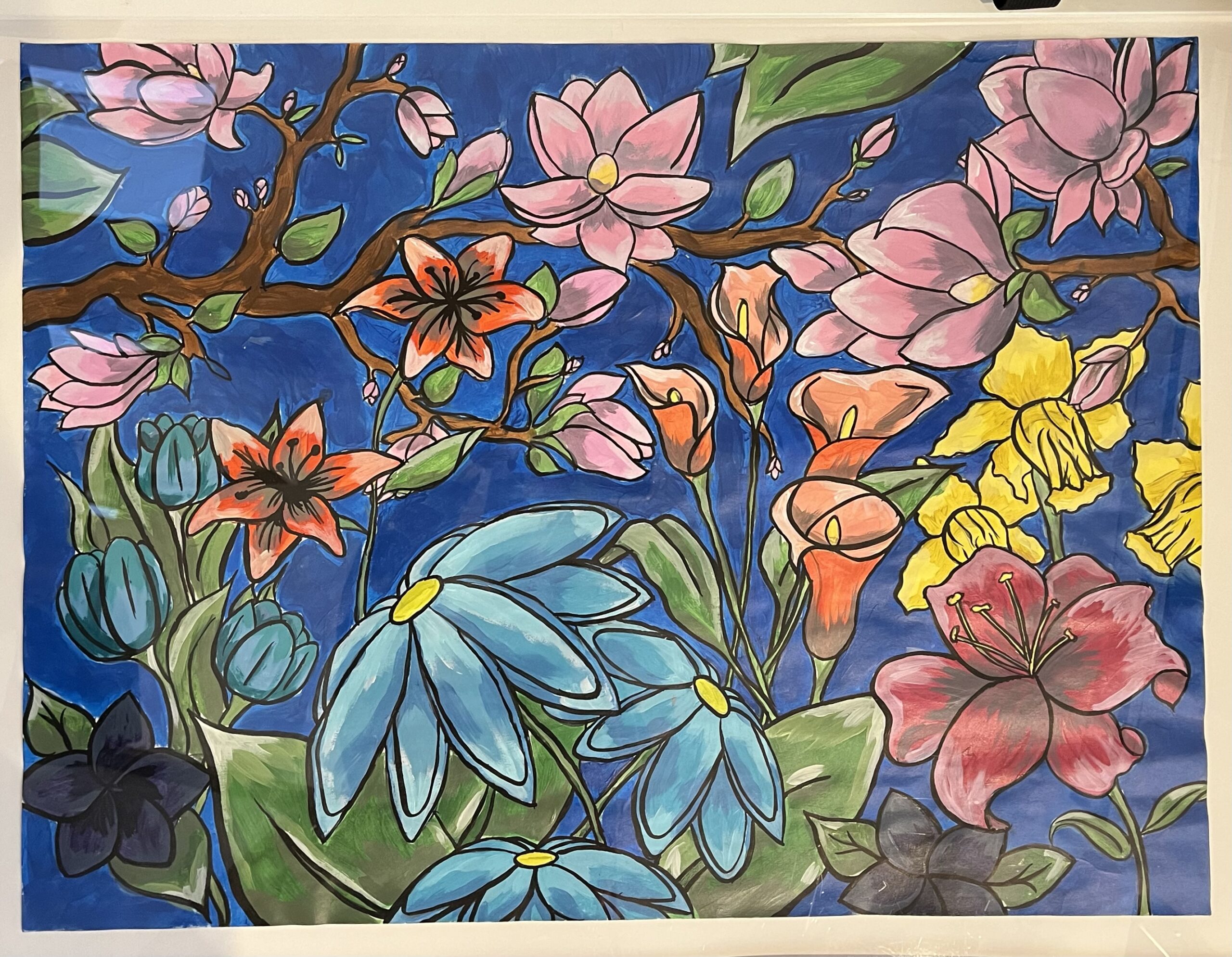 This botanical mural was a collaborative project led by Wakefield’s Lower School art teacher, Mrs. Jones, after their second graders took a field trip to the National Botanic Gardens in Washington, D.C. This creation was in support of their studies on the difference between organic and geometric shapes.