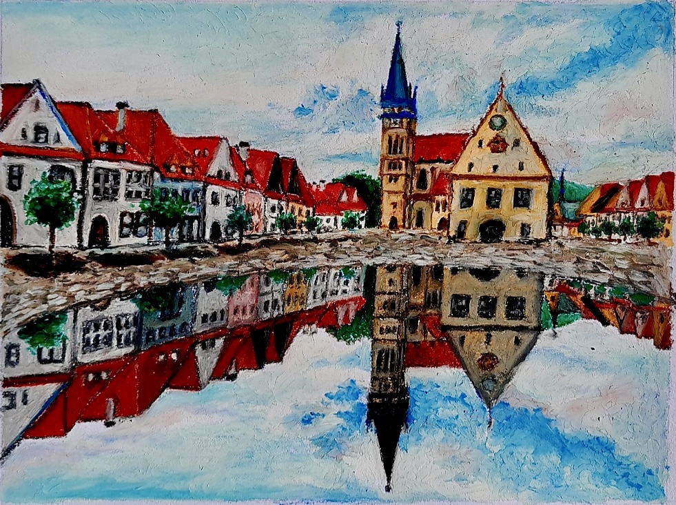 “I decided to draw this because it depicts one of the happiest memories of my life; it reminds me of a trip I took to a small town in Slovakia (called Bardejov) when I was younger. This town is so charming and exquisite to me now, but as a child all I noticed was the colors. I chose to use oil pastels to imitate the simplicity of my younger self’s vision, and the bright colors represent the nostalgic recollection I have of this town. This image is very straightforward, and there is not a lot of room for interpretation; however, the viewer can agree with my piece by reminiscing on their own childhood memories and nostalgia associated with the bright colors that I incorporated in this painting.” Bronte Broadwell, 10th Grade, Foxcroft