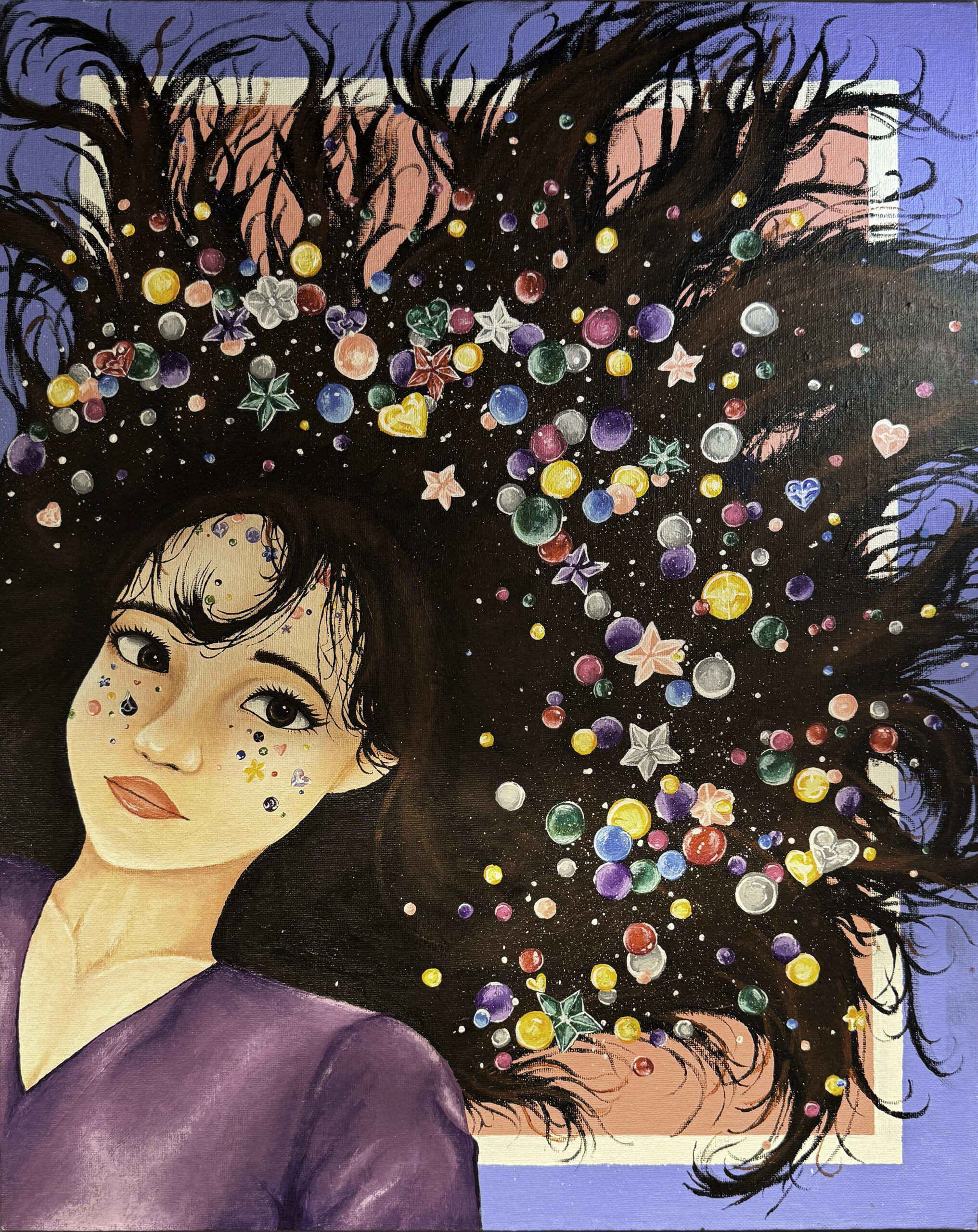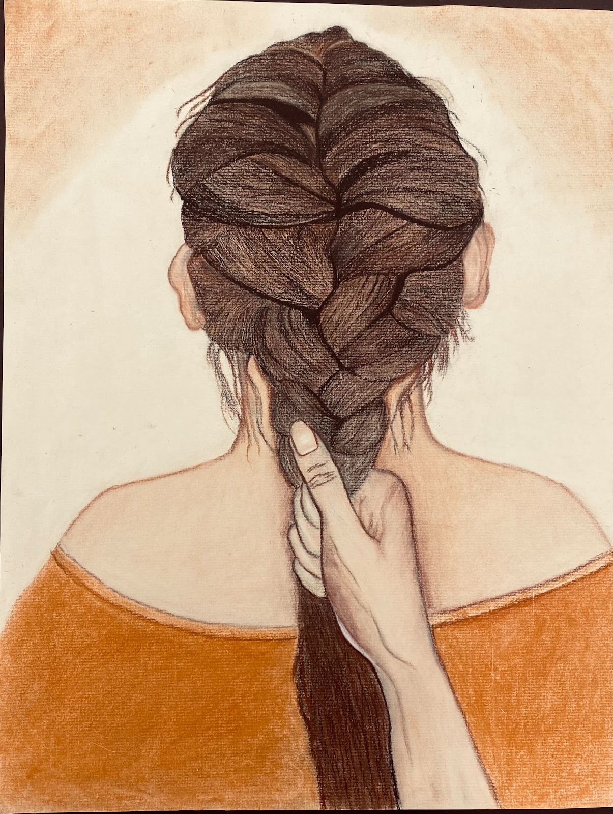 In this work, I explore the concept of life’s lessons through the act of braiding hair. Each strand represents a unique experience or challenge that we encounter. Just as my mother carefully braids my hair, life weaves together these lessons to shape us. It’s a powerful metaphor for resilience, growth, and the beauty of embracing life’s ups and downs.” Lema S., 12th Grade, Foxcroft