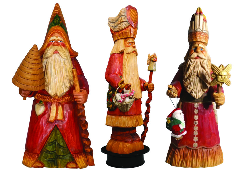 These figures have a distinct “old world” look to them. We call them Father Christmas, as they do not resemble the American Santa Claus at all. Inspiration comes from pictures of antiques, books about old-world Christmas, and the whims of the wood as it is being carved.