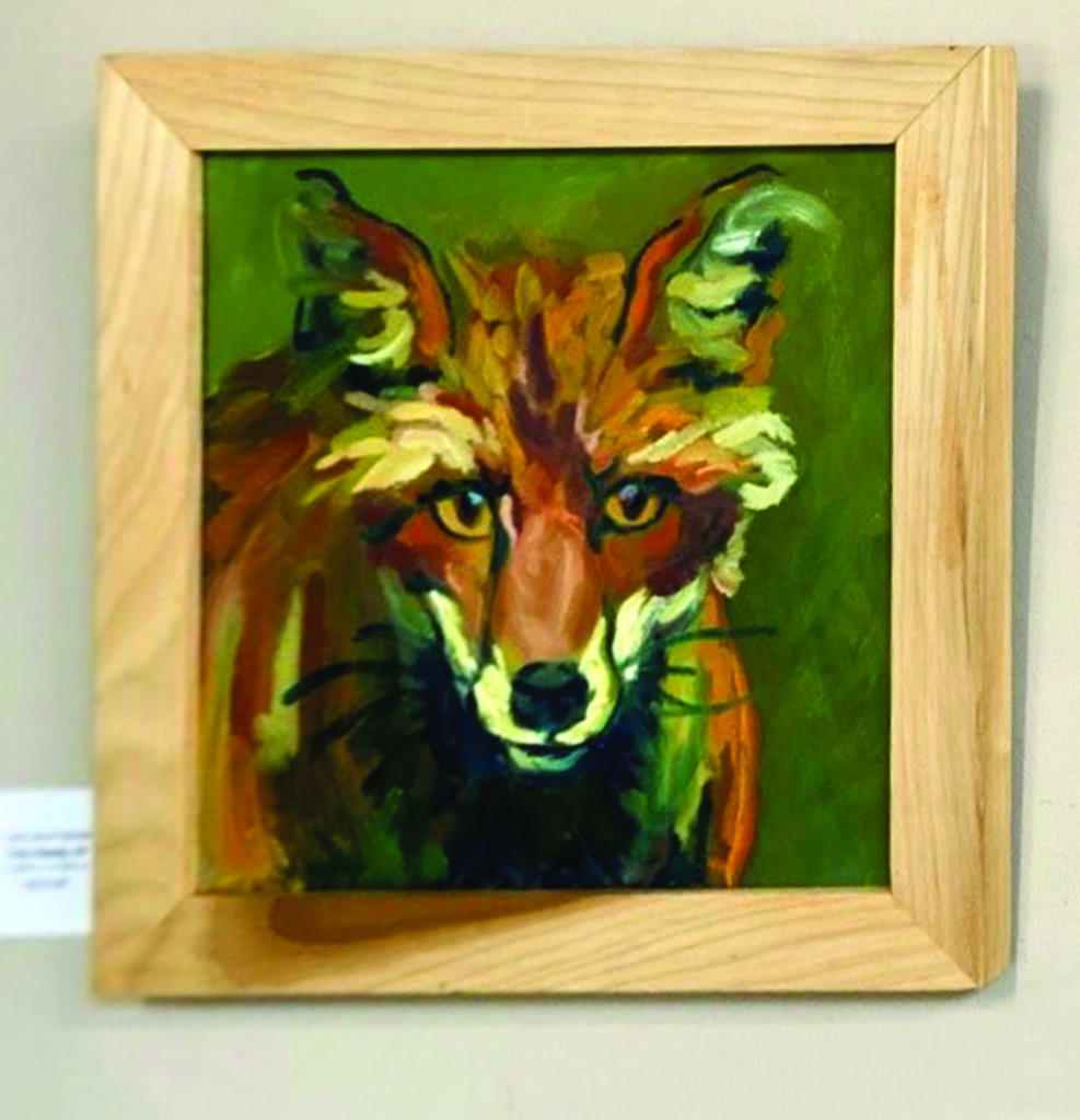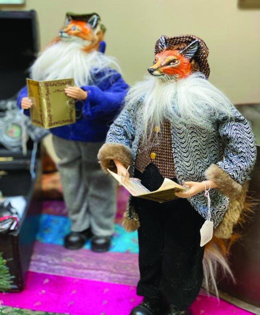 Left: “Fox Study IV,” Gail Guirreri Maslyk, 12”X12,” oil on canvas. Right: Two fox Christmas carolers, hand-painted and sculpted fox faces, Debbie Cadenas, 10” tall.